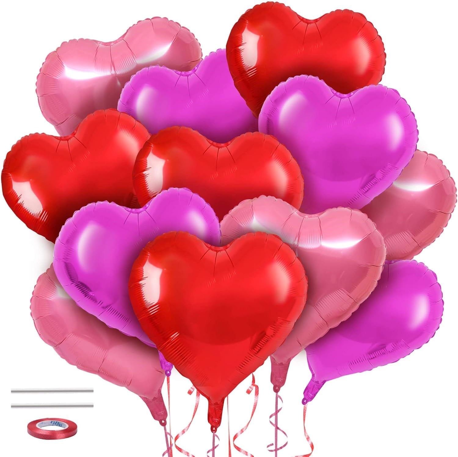 Heart Balloons 12 Pack - 18 Inch Foil Heart-Shaped Balloons in Pink, Magenta, and Red with Ribbon and Straw - Perfect for Valentine’s Day, Mother’s Day, Weddings, Birthdays, and Party Decorations