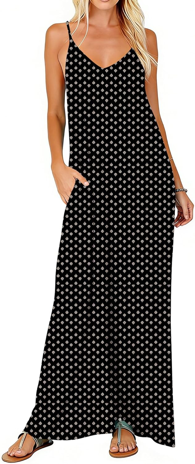 Poetsky Summer Dresses for Women Casual V Neck Spaghetti Strap Long Dresses Black Print M